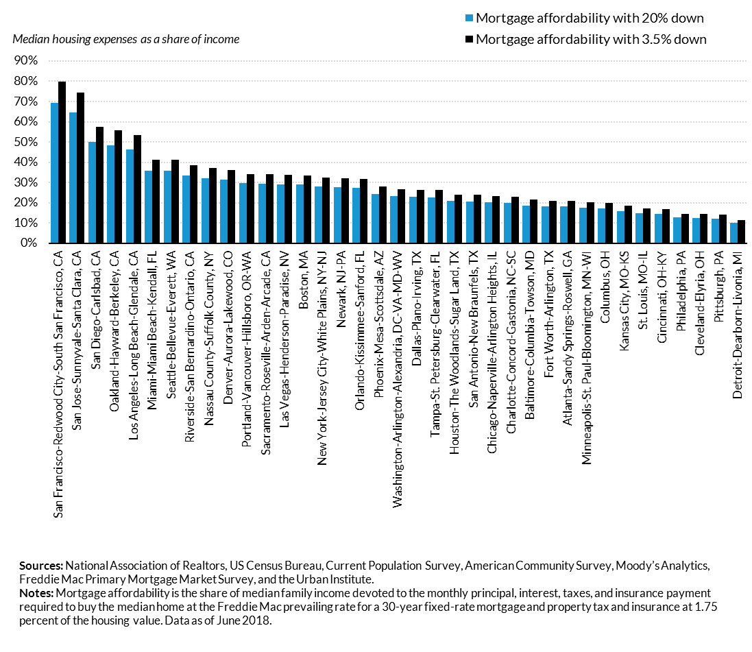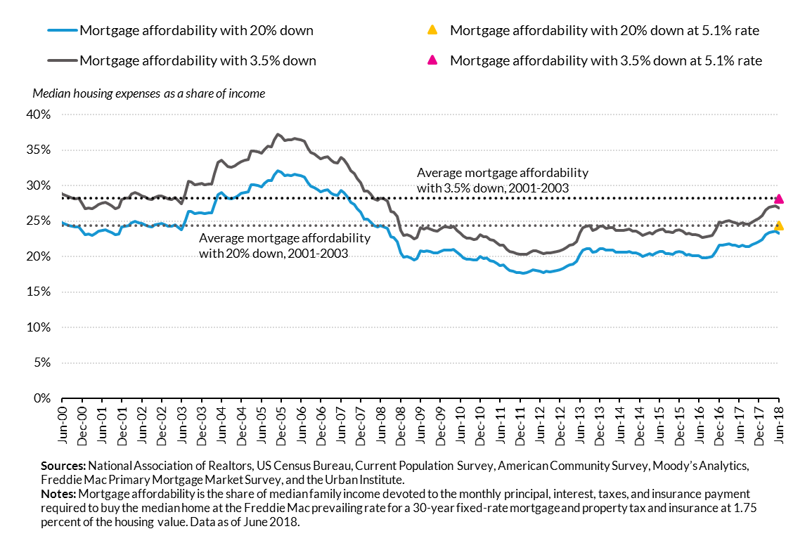 TAs of June 2018, the monthly payment on the median priced house (assuming a 20 percent down payment) would require 23.3 percent of the median income - up from 18 percent six years ago.