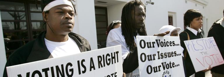 <p>Supporters for a bill that would automatically restore voting rights to convicted felons upon their release from prison hold up signs supporting the bill on Thursday, Feb. 9, 2006, in front of the State House in Montgomery, Ala. Photo by Rob Carr/AP.</p>