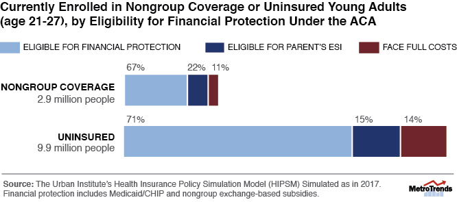 - Approximately 71 percent of the 9.9 million uninsured 21- to 27-year-olds would be eligible for subsidies either through the exchanges or through the expanded Medicaid program.