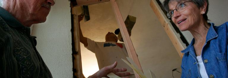 <p>Bill and Helen Bluett discuss paint colors as workers remodel two rooms in their 57-year-old house. The couple took out a reverse mortgage on their home to pay for the work. Photo by Don Bartletti/Los Angeles Times via Getty Images.</p>