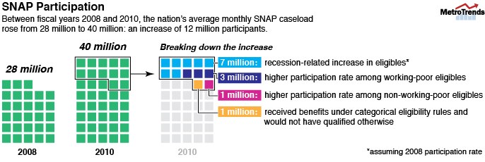 Between fiscal years 2008 and 2010, the nation’s average monthly SNAP caseload rose from 28 million to 40 million: an increase of 12 million participants. About 11 million (92 percent) received SNAP under standard program rules. Only 1 million (8 percent) got SNAP through categorical eligibility rules and would not have qualified otherwise.