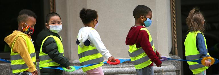 <p>Youngsters in a preschool class wear vests and masks and hold on to a strap as they take a walk outdoors on Arlington Street escorted by adult childcare providers in Boston, Massachusetts, on September 18, 2020. (Photo by John Tlumacki / The Boston Globe via Getty Images)</p>