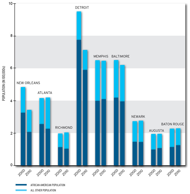 It’s not that simple, as the numbers show. For example, if you take nine cities that were at least half African American in 2000 and look at what has happened in the past decade, you’ll see several different stories. Five of them—New Orleans, Atlanta, Richmond, Baltimore, and Newark—saw declines in the proportion of the population that was African American, while four—Detroit, Memphis, Augusta, and Baton Rouge—had increases. But the details differ.