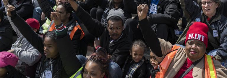 <p>Flint residents and allies from regions nearby pose for a group photo during a protest on the steps of the Michigan State Capitol on April 11, 2018 in Lansing, Michigan. The state-run water distribution sites are closing after officials said the water quality is meeting federal standards. This has left residents scrambling to find an alternative as many still do not feel it is safe to drink the tap water even with a filter. (Photo by Brittany Greeson / Getty Images)</p>