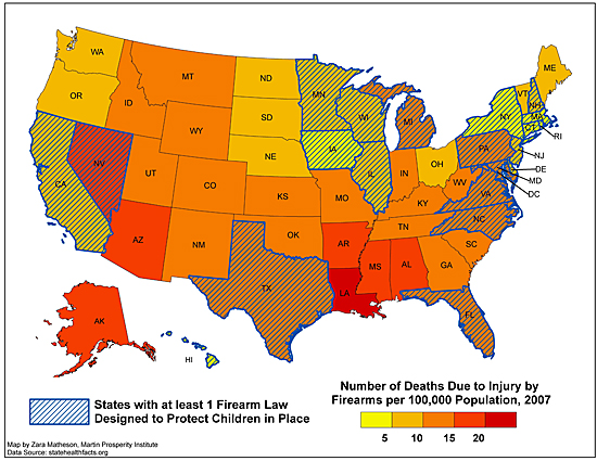 After the Gabby Giffords shooting last January, Richard Florida of the Atlantic produced an interesting graphic purporting to show a correlation between states with one of three gun control laws (assault weapons bans, trigger locks, and safe storage requirements) and lower homicide rates. While he takes great pains to note that the relationship is not causal and merely a positive correlation, the obvious takeaway is that the absence of gun control laws leads to more homicide.