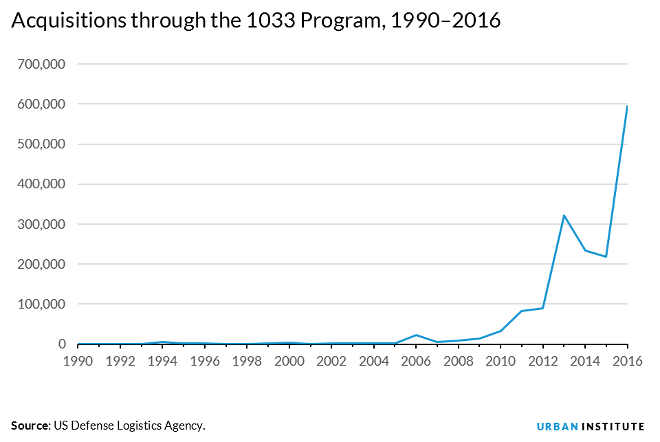 One program that facilitates police militarization is the Pentagon’s 1033 program, where local law enforcement agencies can acquire military surplus equipment at little cost. The Pentagon has a website that provides data on all acquisitions made by local law enforcement agencies. Although this program has been in existence since 1989, law enforcement agencies have only recently begun to take advantage of the available surplus. Military surplus acquisitions spiked in 2013, with 320,704 purchases, and nearly doubled in 2016.