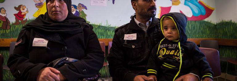 <p>Houria Al Zakri and Sarhan Aldobai holding Alaa Nour Eddin Aldabbi sit in the waiting room to sign up for the Supplemental Nutrition Assistance Program in Louisville, KY on Thursday, December 17, 2015. The Aldabbi family fled Syria 4 years ago and after living in refugee camps in Jordan finally arrived in the United States with the help of the Kentucky Refugee Ministries. Photo by Jabin Botsford/The Washington Post via Getty Images.</p>