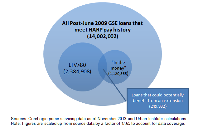 When we further divided the group of 249,932 who could potentially benefit from an extension by their origination dates, we tallied 113,998 borrowers that could benefit from a one-year extension of the cut-off date, and 200,632 that could benefit from a two-year extension. These numbers are dwarfed by the 846,677 pre-June 2009 borrowers that remain eligible without an extension, and over 3 million who have already benefited from a HARP refinance.