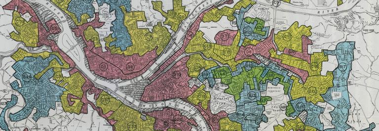 <p>A redlining map of Pittsburgh, Pennsylvania, produced by the Home Owners’ Loan Corporation used to appraise home values and neighborhoods. Source: <a href="https://catalog.archives.gov/search?q=*:*&f.parentNaId=3620183&…; target="_blank">National Archives</a>.</p>