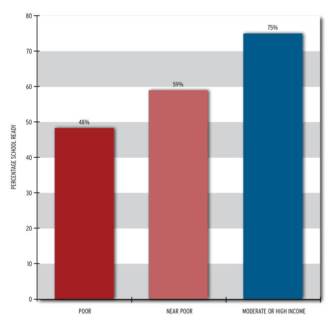 Unfortunately, only about half (48 percent) of poor five-year-olds who enter kindergarten this fall will be “school-ready” in terms of having early math and reading skills, good physical health, and age-appropriate behaviors (some ability to pay attention and work on task, not too many temper tantrums or other problem behaviors). By comparison, 75 percent of children from families with moderate and high incomes will enter school ready to learn (see figure below). Whether this disparity is because of poor families’ inability to secure the resources needed for healthy development (such as nutritious meals, high-quality child care settings, and neighborhoods free of crime and pollution) or because of the negative effects of poverty on parental stress and family dynamics, large numbers of poor children lag behind their peers and start school at a disadvantage from day one.
