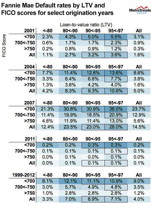 The default rates for different FICO and LTV combinations of the loans originated in four select issue years—2001, 2004, 2007, and 2011—are shown in the table below. Between 1999 and 2012, the overall default rate for 90 to 95 percent LTV mortgages was 6.9 percent. It was marginally higher, at 7.1 percent, for the 95 to 97 percent LTV mortgages (see table below).