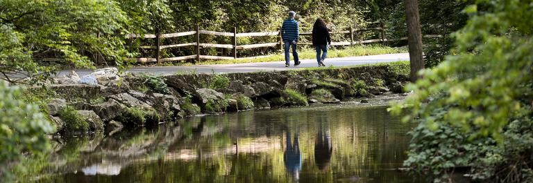 <p>People walk along a paved portion of the Creek Trail running next to the Wyomissing Creek in Wyomissing, Pennsylvania, on September 15, 2020. (Photo by Ben Hasty/MediaNews Group/Reading Eagle via Getty Images)</p>