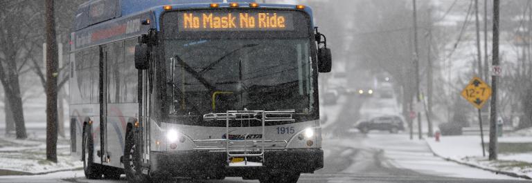 <p>A Berks Area Reading Transportation Authority bus with a message displayed reading "No Mask No Ride" drives up Walnut Street to the intersection with 13th Street in Reading, Pennsylvania, on December 16, 2020, during a snow storm. (Photo by Ben Hasty/MediaNews Group/Reading Eagle via Getty Images)</p>