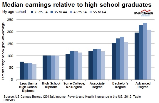 The stories of recent college graduates struggling in the labor market, while real and painful, are more signs of a weak economy than of the failure of higher education. Unemployment rates are over twice as high for high school graduates in the same age range. Also, the earnings premium for a college education grows as workers age so it takes time to reap the full benefits. Full-time workers ages 25 to 34 with bachelor’s degrees have a 53 percent earnings premium over high school graduates. That premium grows to 72 percent for those ages 35 to 44, and to 79 percent for workers ages 45 to 54.