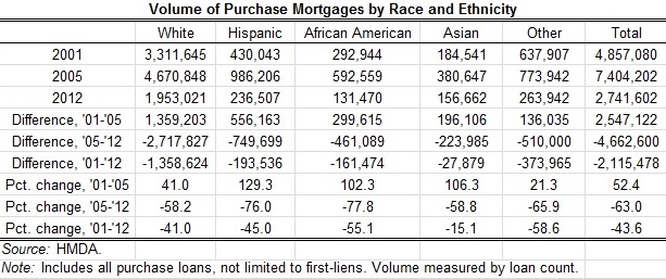 After 2005, however, the number of purchase loans to African American and Hispanic borrowers declined by 76 and 78 percent. For African Americans, that’s a decline from over half a million loans to 131,470 between 2005 and 2012; for Hispanic borrowers, a decline from 986,206 in 2005 to less than 250,000. Yet loans to non-Hispanic white and Asian borrowers declined by only 56 and 59 percent.