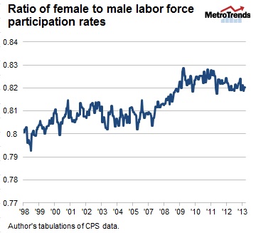 Back in 1998, only about 80 women for every 100 men were engaged in the labor force. That ratio peaked near 83 in 2009 just after the recession.