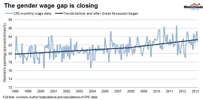 In the prolonged jobless recovery, the ratio has remained steady around 82, well above historical averages. Women have done even better on employment relative to men.