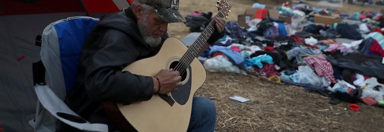 <p>Camp Fire evacuee Kelly Boyer plays guitar in front of his tent next to a Walmart parking on November 16, 2018 in Chico, California. (Photo by Justin Sullivan/Getty Images)</p>