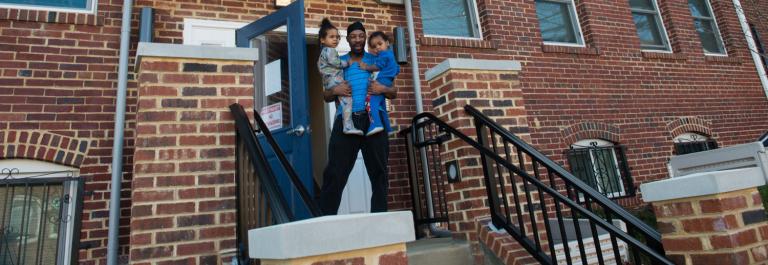 <p>Michael Jackson, center, holds the children of his downstairs neighbor, Samarjae Martin, 3, left, and Omar Martin Jr., 2. The children belong to Sweat Equity participant, Omar Martin. A year and a half ago, the District launched a pilot program called Sweat Equity, in which it took a group of people who had been both homeless and on TANF and put them to work renovating abandoned city buildings. The hope was that by the end of the program, the individuals would now have jobs and a place to live. Several of them are now living in the building. Photo by Sarah L. Voisin/The Washington Post via Getty Images</p>