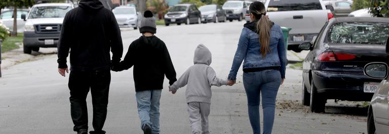 <p>SAN LORENZO, CA - APRIL 9: Christian (left) and his wife Monze (right) were laid off from restaurant jobs in mid-March and not qualified to receive unemployment because they are undocumented immigrants as they walk with their 9 and 4 year old sons on Thursday, April 9, 2020, in San Lorenzo, Calif. (Liz Hafalia/The San Francisco Chronicle via Getty Images)</p>