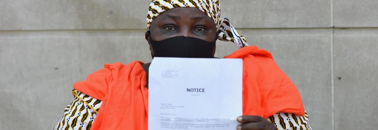 <p>Manty S. Kaba holds up a notice to pay an outstanding rent balance from her apartments' property management company, during a protest against evictions and in support of the movement to "cancel rent" outside the Bronx housing court on August 10, 2020 in the Bronx borough of New York City. (Photo by ANGELA WEISS/AFP via Getty Images)</p>