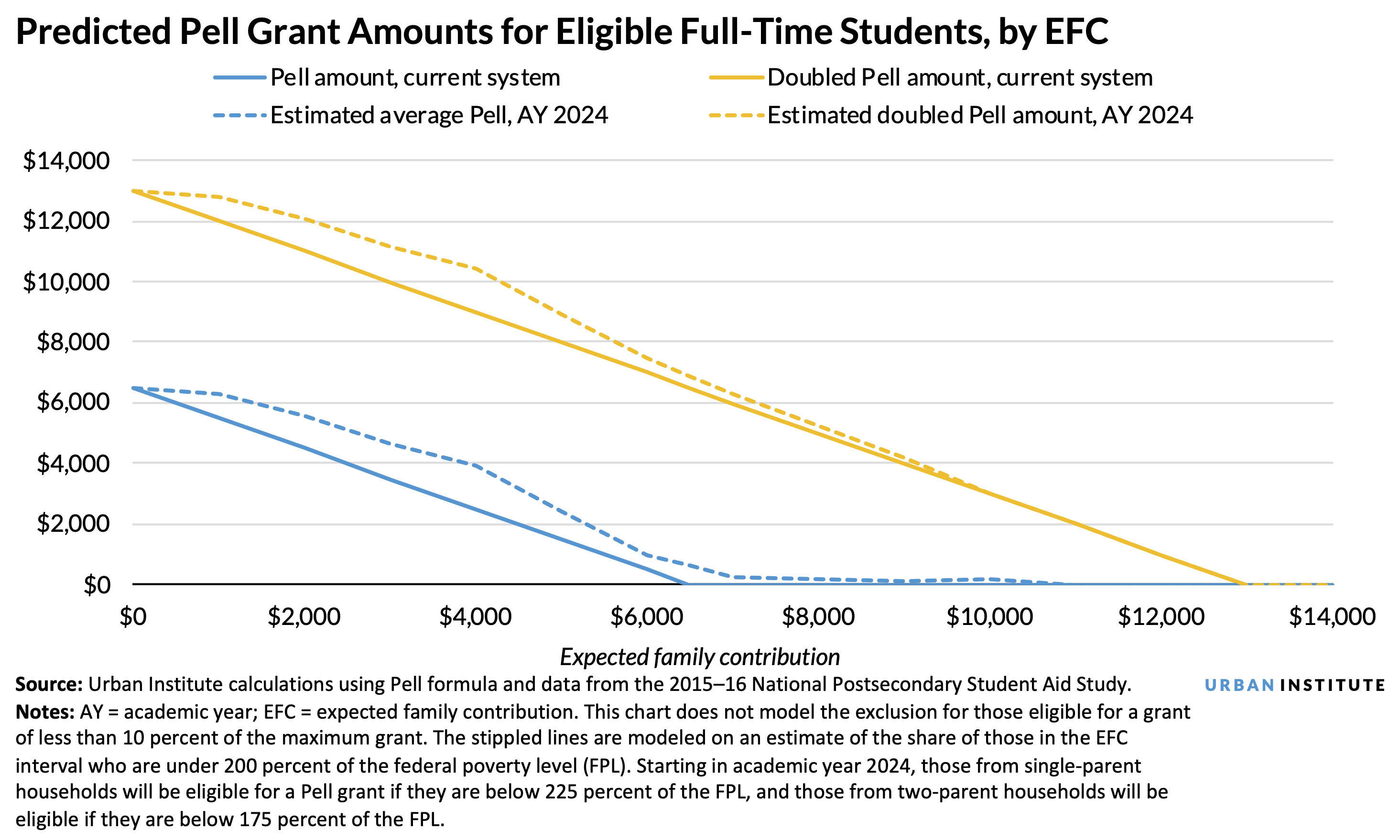 Because of how the Pell formula works, doubling the maximum Pell grant would not only increase the amount of grant aid for current recipients but would also expand eligibility to more students from middle-income households.