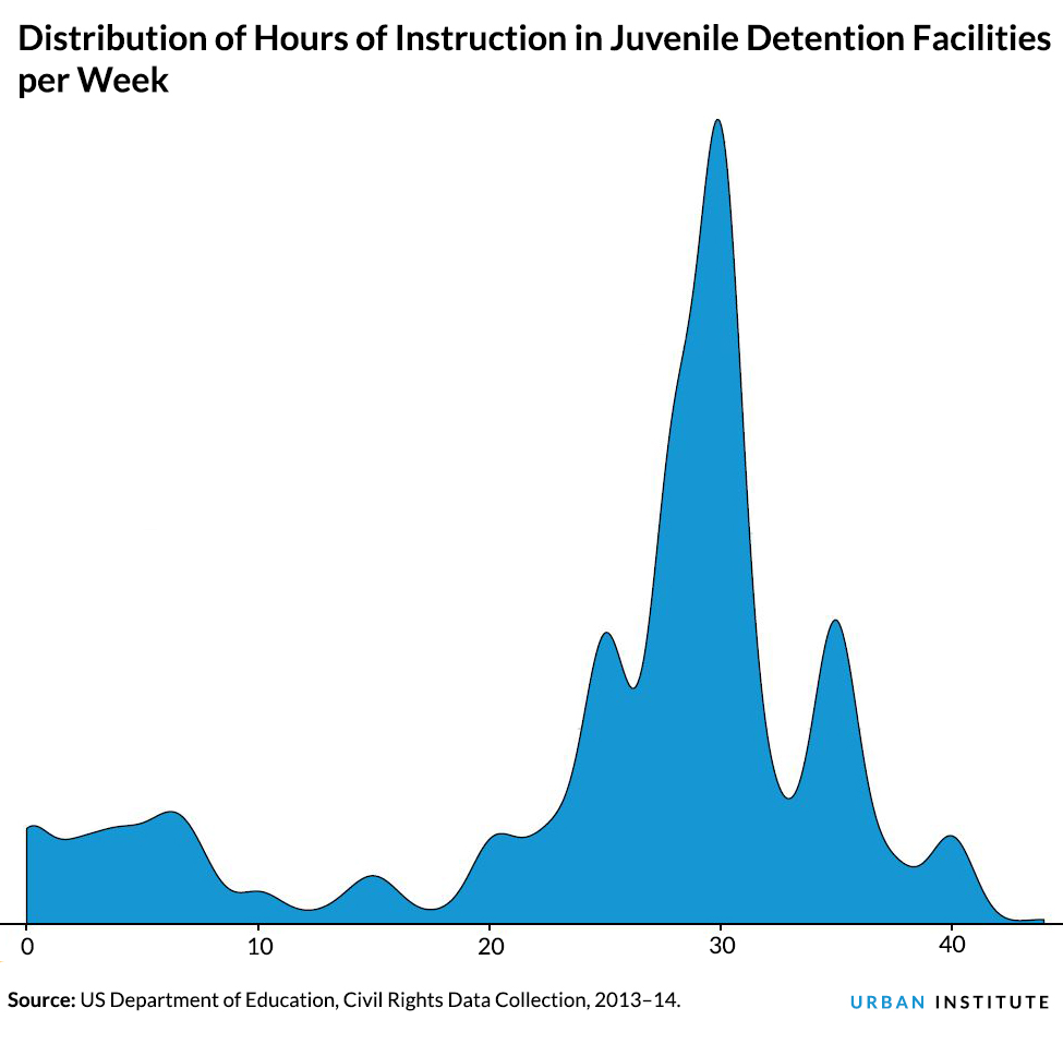 Data from the US Department of Education Office of Civil Rights (OCR) show students attending schools in juvenile detention facilities received, on average, 25 hours of instructional time per week, 8 fewer hours than the 33 hours their peers in traditional public schools spent in class.