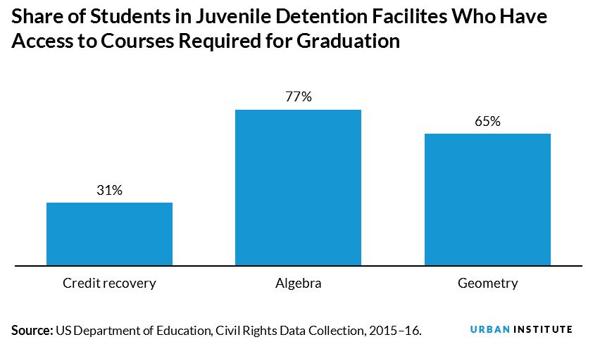 When incarcerated youth spend time in class, the courses available may not be sufficient for high school graduation. Limited OCR data show that 23 percent of students attending schools in juvenile detention facilities do not have access to algebra and 35 percent do not have access to geometry, courses required to obtain a high school diploma in many states.