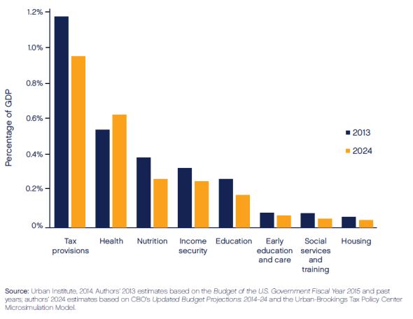 One major conclusion: despite several years of modest economic recovery and some budgetary successes for kids in previous decades, our elected officials—Democrats and Republicans, conservatives and liberals alike—have decided that kids must take it on the chin for the foreseeable future. Meanwhile, the rest of us will continue to gain, mainly when we hit older ages. Our retirement and health benefits will continue to grow, and we will continue to keep our taxes too low to pay for these benefits and the rest of government, no matter how well the economy is doing. Not that we or our elected officials would ever say this directly: you’ll be lucky to hear any discussion of these choices in any 2014 campaign.