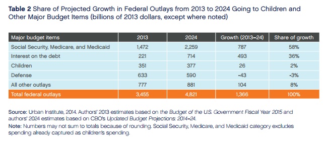 It doesn’t have to be that way. For over twenty years, a consensus of sorts has developed that early educational and similar interventions, if done well, are a solid investment in our future. Yet progress here has been extremely slow. Child advocates are told that even $20 billion a year is out of reach in our “time of austerity.” But $20 billion is only about 1/40th of the expected growth in annual spending on Social Security, Medicare, and Medicaid (excluding the children’s share) by 2024. There’s also a growing consensus on creating a budget more oriented toward mobility and opportunity, but it’s still mainly rhetoric.