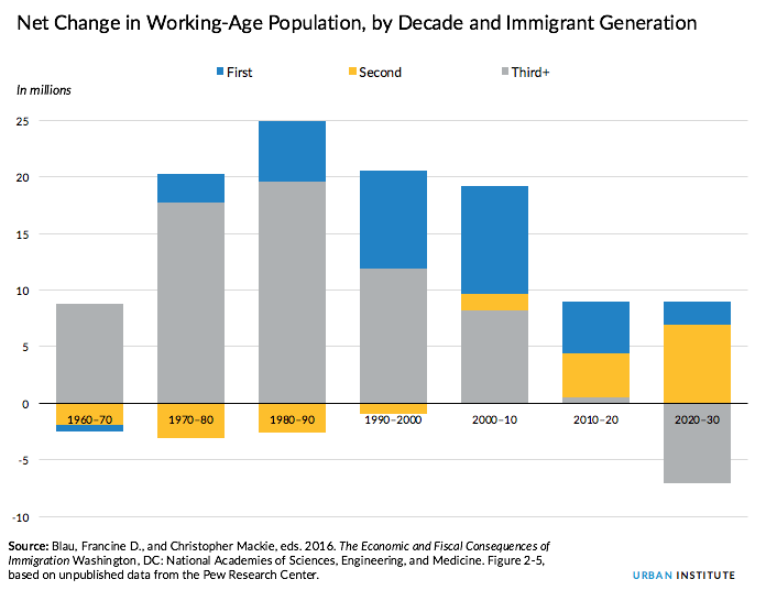 How immigrants and their children fit into the workforce picture is neatly explained in the graph below, which comes from the recently released report from the National Academies of Sciences on the economic and fiscal consequences of immigration. To measure the transformation in workforce growth, the report looks at changes in the working-age population among three groups: the immigrant generation (first generation), their children (second generation), and all native-born whose parents are also native-born, (third-plus generation).