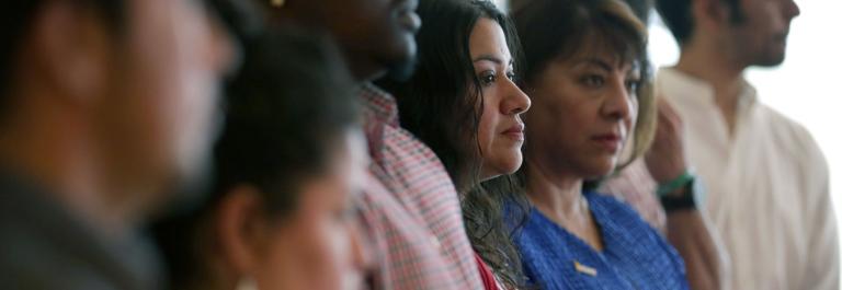 <p>Marcia Cruz (C), who is originally from El Salvador, stands with other immigrant workers during a rally on May 18, 2015 at the headquarters of AFL-CIO in Washington, DC. Labor leaders were joined by immigrant workers in the rally and vowed to defend President Barack Obamas immigration executive actions. Photo by Alex Wong/Getty Images</p>
