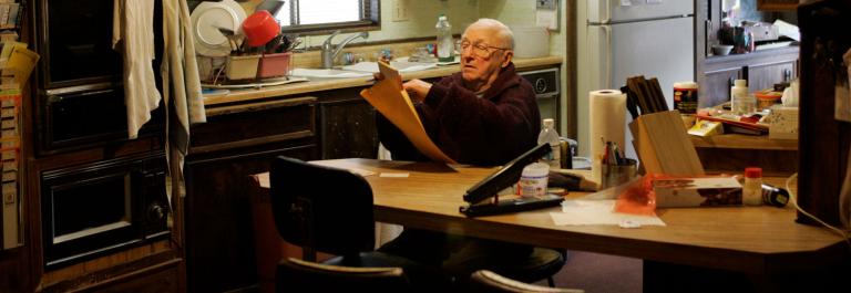 <p>Living without heat, Rev. Harold Ruddick, 83, wears sweaters to keep warm in his decades old doublewide at Ojai Oaks Mobile Home park in Ojai, which is considering converting to a tenantowned park. Ruddick lives on less than $26,000 a year. Photo by Stephen Osman/Los Angeles Times via Getty Images.</p>