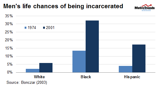 What’s more, incarceration rates have skyrocketed since King first announced his campaign in 1967. The lifetime chances of incarceration are nearly three times higher for a young African American man born in 2001 than in 1974 [figure 1]. Today, 932 out of every 100,000 men are incarcerated, but the rates are highest for African Americans, with 3,023 per 100,000 men in prison, compared with 478 for white men and 1,238 for Hispanic men.