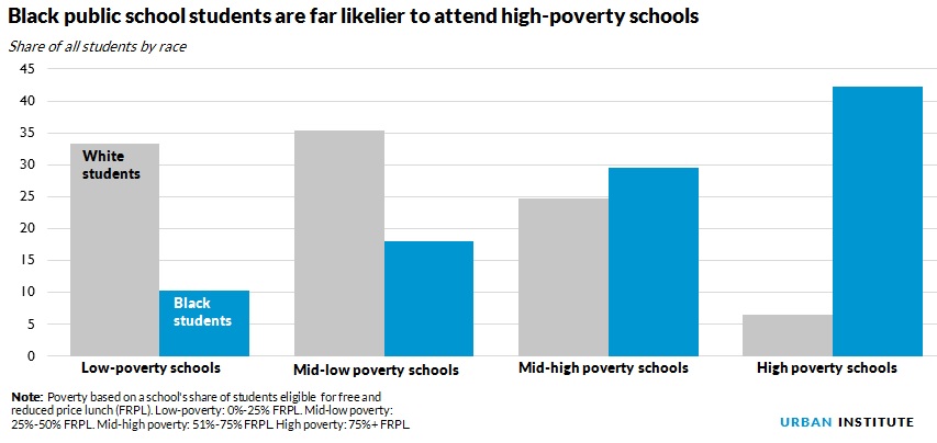 Exposure to concentrated neighborhood poverty harms kids’ life chances. But it’s not just African American kids’ neighborhoods that expose them to concentrated poverty. Black kids are also uniquely exposed to concentrated poverty in their public schools.
