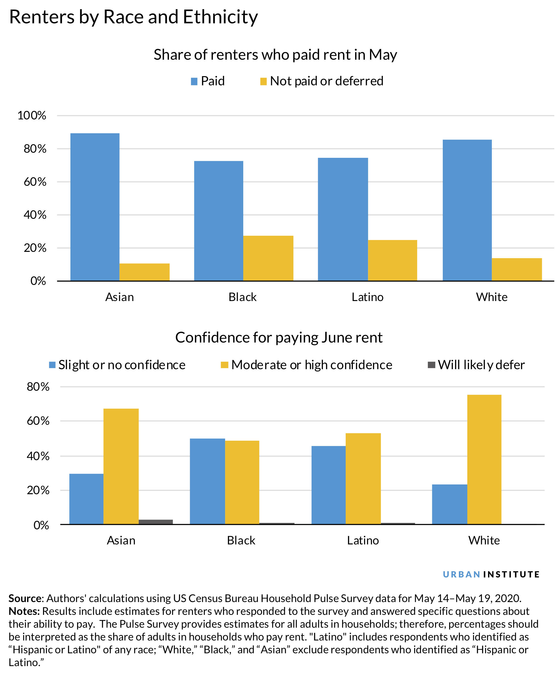 The Pulse survey reveals striking differences by race and ethnicity as to who paid rent in May, as well as who expects to be able to pay next month. About a quarter of Black and Latino renters who responded to the survey did not pay or deferred rent in May, compared with 14 percent of white renters. And while a quarter of white renters expressed slight or no confidence in their ability pay rent in June, nearly half of Black and Latino renters expressed similar concern.