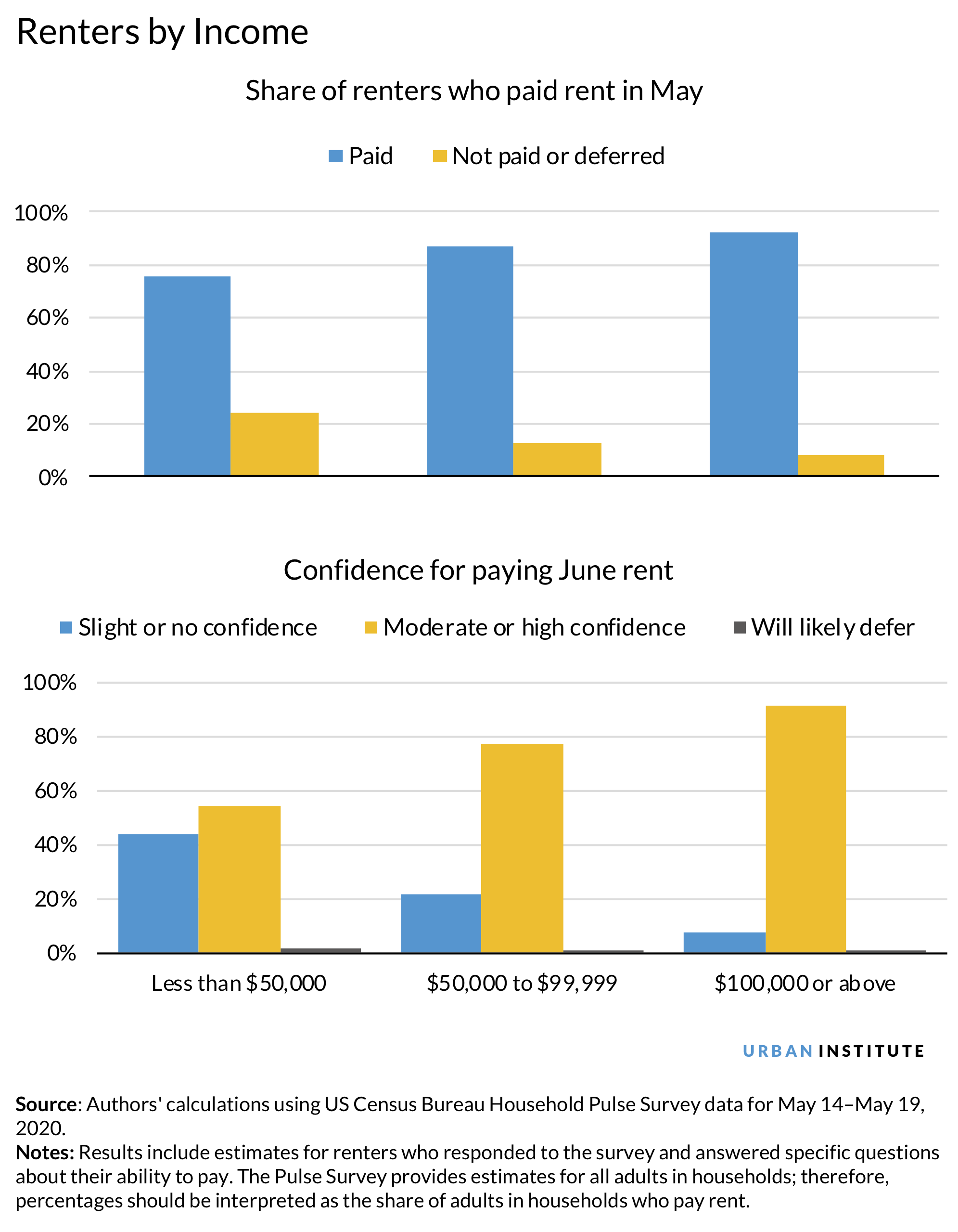 Lower-income renters were already more likely to be cost-burdened before the pandemic started and had less money saved to weather financial shocks. Now we are seeing they were also less likely to cover rent in May than their higher-income counterparts. About a quarter of renters making less than $50,000 a year did not pay or deferred rent this month, compared with only 8 percent of renters making $100,000 or more a year.