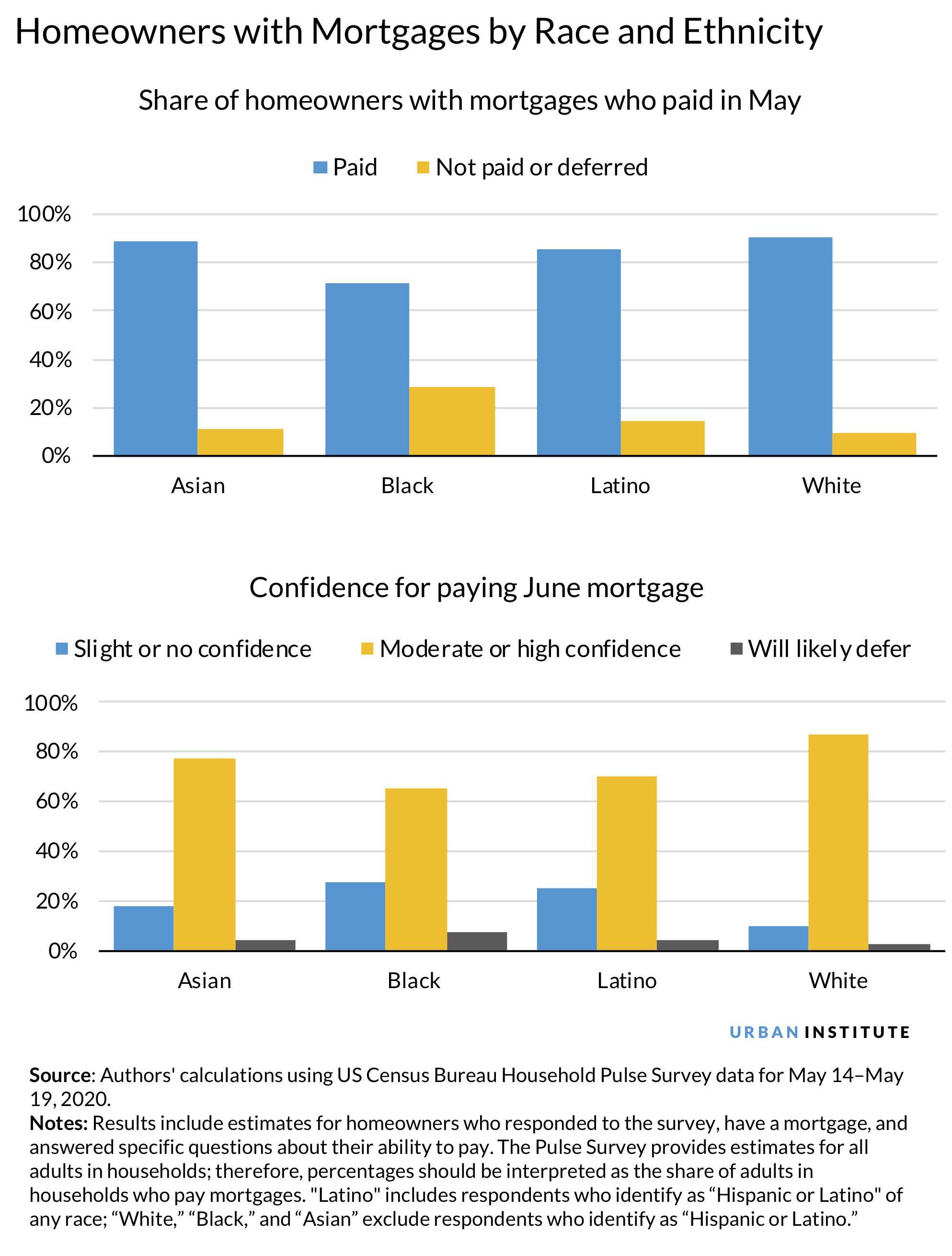 The Pulse survey also reveals significant differences in ability to pay mortgages this month and who expects to be able to pay next month. Among people with mortgages, 28 percent of Black homeowners did not pay or deferred their mortgage in May, compared with only 9 percent of white homeowners. Latino and Asian American homeowners with mortgages paid this month at rates of 15 percent and 11 percent, respectively.