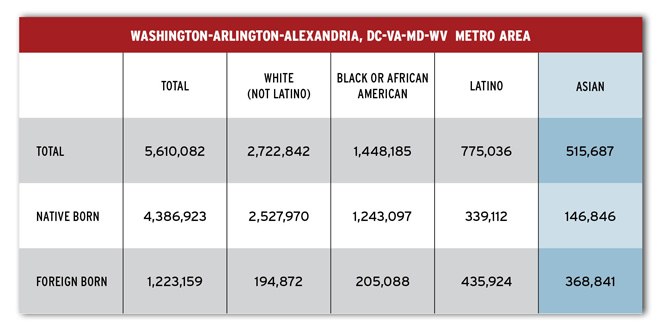 In the D.C. Metro Area, 9.2 percent of residents are Asian, most of them foreign born.