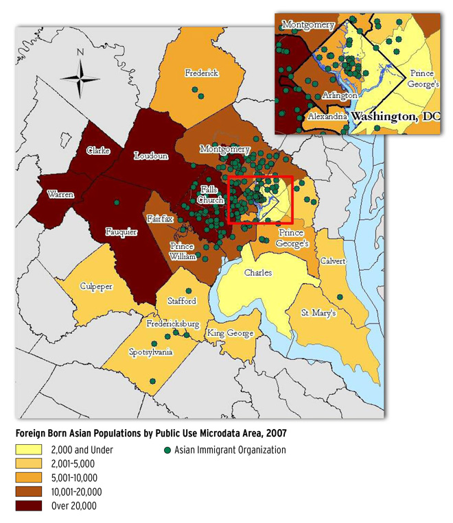 Nonprofits serving immigrants are clustered around Washington, D.C. while Asians have been moving into outlying suburbs and counties for jobs and homes. This spatial mismatch however should resolve itself in time as Asian and other immigrants integrate and start new associations, much as those before them did -- thanks to nonprofits that helped pave the way.