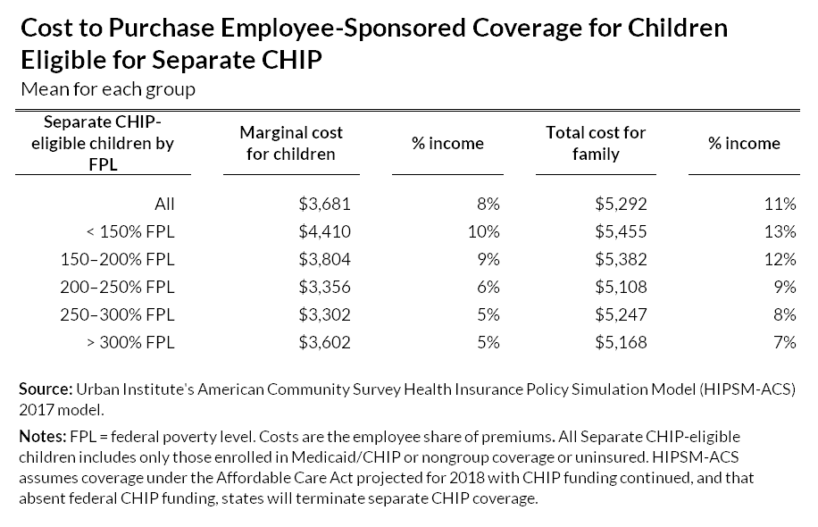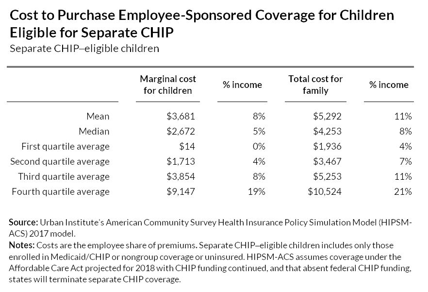 Families ineligible for tax credits who turn to employer plans to cover their children face premiums that represent large shares of their incomes. For those losing eligibility for separate CHIP, enrolling a child in a parent’s employer-sponsored plan will typically cost 8 percent of family income and bring the total cost of covering the family to 11 percent, on average.