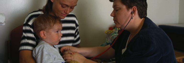 <p>Hunter Kincade sits on his mother's lap during a medical checkup with pediatrician Victoria Shepperd at Huff Center at Thoms Rehabilitation Center in Asheville, North Carolina. Photo by Owen Franken/Getty Images.</p>