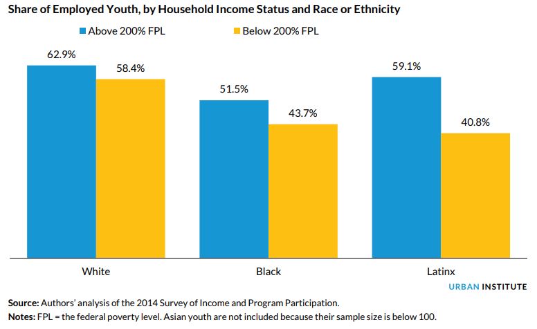 And though black and Latinx youth are more likely than white youth to live in low-income households, the racial and ethnic gap in employment rates persisted, even after accounting for income level.