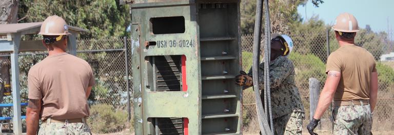 <p>Seabee students from Naval Construction Training Center Port Hueneme guide a new vibratory driver/extractor system into position while practicing pile driving operations, June 14. (Photo by Amber Vaglica / Seabee Magazine)</p>
