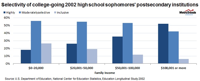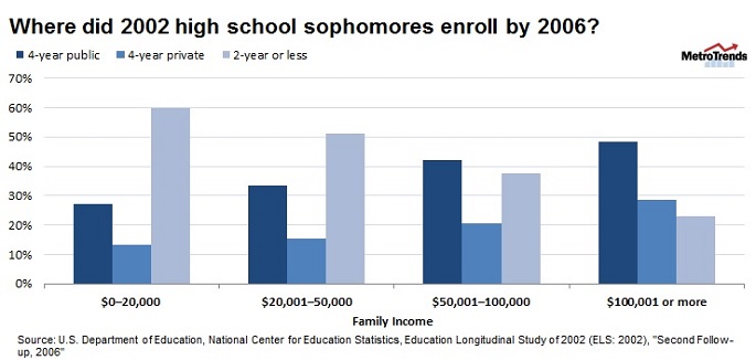 The enrollment rate dropped to 78 percent for sophomores with family incomes between $50,000 and $100,000, 63 percent for family incomes between $20,000 and $50,000, and just 52 percent for students from families earning less than $20,000.