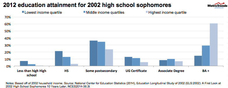 First, who is most likely to get some college education? Of 2002 high school sophomores, fully 91 percent enrolled in a postsecondary institution by 2012—that is, if we only look at sophomores whose 2002 family income was above $100,000.