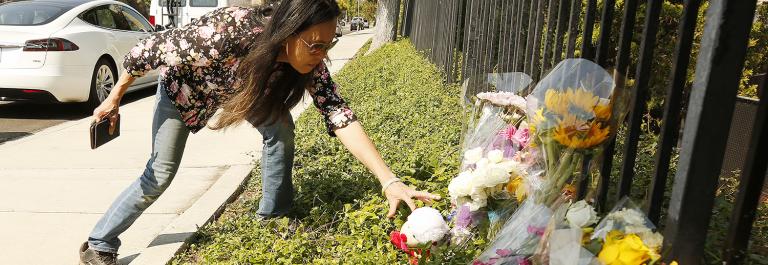 <p>WESTLAKE VILLAGE, CA - SEPTEMBER 30: Amy Kron of Westlake Village places a plush toy were at a memorial for two brothers who were fatally injured while crossing Triunfo Canyon Road at Saddle Mountain Drive in their Westlake Village neighborhood with their family at 7:10 pm Tuesday evening. Rebecca Grossman, 57, a co-founder of the Grossman Burn Foundation was arrested on two counts of vehicular manslaughter in the death of the two juvenile pedestrians that were in the crosswalk and is being held on $2 million bail. Westlake Village on Wednesday, Sept. 30, 2020 in Westlake Village, CA. (Al Seib / Los Angeles Times)</p>