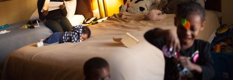 <p>Tiera Williams, 25, reads an official letter as her children (left to right) Quintin, four weeks, Isaiah, 1, and Ariyanna, 5, play in the family's room at a Days Inn in NE Washington, DC, on December 16, 2015. The hotel had been leased by the city as a shelter for homeless families. Tiera's routine includes rising at 6:15, to dress the kids and taking two buses across town to get Ariyanna to kindergarten at a school in Southeast Washington. Photo by Allison Shelley/The Washington Post via Getty Images.</p>