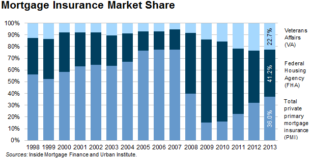 Since hitting a low in 2009, private mortgage insurers (PMIs) have slowly but surely been picking up market share compared with FHA and Veterans Affairs (VA) loans (figure below). Prior to the financial crises, private mortgage insurers were the primary insurance source for high loan to value (LTV) lending, representing almost 60 percent of the total in 2000 and 77 percent in 2007. By charter, Fannie Mae and Freddie Mac (the GSEs) cannot be in the first-loss position on mortgages greater than 80 LTV; these mortgages require mortgage insurance. After the financial crises, the mortgage insurers raised their premiums, while the FHA insurance premiums did not increase. As a result in 2009 and 2010, the FHA share ballooned, and the PMI share hit a low of 15 percent. Since then, FHA insurance premiums have been raised several times, resulting in an increase in the PMI share to 36 percent for 2013 (41 percent in the fourth quarter of 2013). This was accompanied by a corresponding decrease in the FHA share.