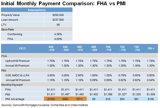 The bottom section of the table shows the payments on an FHA loan and on GSE loans with mortgage insurance for borrowers taking out a $237,500 mortgage on a $250,000 house (95 LTV) who have different FICO scores. The private mortgage insurance premium rates, as well as the calculation methodology, were obtained from Genworth Mortgage Insurance. The FHA payment is $1411 at all FICO levels. The payment on a GSE mortgage for a 660-679 FICO borrower would include a 2.50 percent LLPA, translating into 50 bps per annum, and an private mortgage insurance annual premium of 115 bps, for a total payment of $1482/month. This is $71 more than the borrower would pay on an FHA loan.